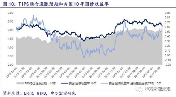 从TIPS隐含通胀预期来看,本周美国10年期国债收益率小幅下降,收于2.22%关口。虽然一季度增速放缓,近期通胀不及预期,但是特朗普医改方案和税改方案的推出,增强了市场信心,同时5月FOMC议息会议维持基准利率不变,认为一季度美国经济增速放缓只是暂时现象,释放偏鹰派信号。6月加息预期增加,作为美国资产价格代表性指标的美国10年期国债收益率将会得到支撑。