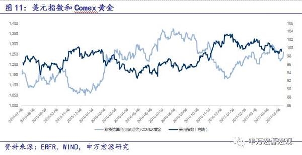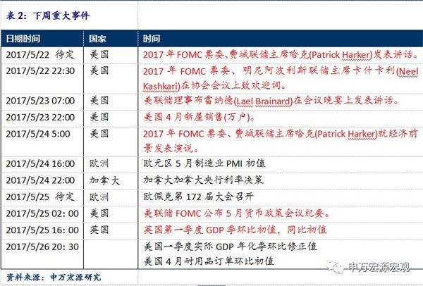 从5月份议息会议的经济预测以及利率点阵图来看,对比3月份的会议情况,利率点阵图显示利率2017年加息路径不变,美联储对前景整体乐观。预计2017年加息两到三次。我们认为未来美联储加息次数主要取决于特朗普的政策落地情况。若是税改和增支进展顺利,美联储要急于行动,预防通胀,6月可能加息。但目前特朗普困难缠身,加息更大概率预计出现在下半年9月或12月。