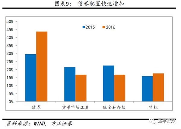 1)从配置时间上看,债券配置主要是上半年占比大幅增加。2016年末,理财配置债券较2015年底提高14个百分点,超2016年6月末3个百分点,2016年下半年以来增速放慢是央行锁短放长去杠杆、四季度起表外理财纳入MPA考核、中美加息预期、债市调整等因素所致。