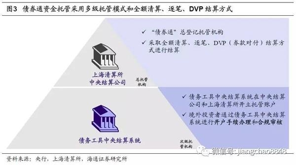 债券通的主要实现方式。1)接入:互联互通“一点接入”.此前境外投资者参与内地银行间债市,须委托具备国际结算业务能力的银行间债券市场结算代理人完成备案、开户等手续,时间较长且成本较高。而在债券通机制下,境外投资者可直接依靠内地与香港的基础设施互联和多级托管来“一点接入”内地银行间债券市场。2)交易:初期为机构做市。在交易流程上,境外投资者可以与做市商开展请求报价方式的银行间现券买卖,该模式有效降低了境外投资者的交易对手方风险。与此前依靠结算代理银行单一报价进行交易相比,债券通的交易机制更有利于价格发现。3)托管结算:多级托管模式。在资金托管方面,境外投资者通过债券通投资内地银行间债券市场,采用多级托管模式,上海清算所为总登记托管机构,CMU为次级托管机构。在结算安排方面,境外投资者可直接通过CMU进行开户手续办理和合规审核,并通过CMU在中央结算公司和上海清算所开立的账户进行结算。境外投资者需要在中央结算公司、上海清算所开立名义持有人账户,采取全额清算、逐笔、DVP(券款对付)结算。