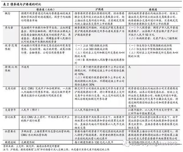 债券通与沪港通同为内地资本市场开放的重要手段,先期开通的“北向通”与“沪股通”两者在机制设计上有颇多相似之处,例如,均通过内地与香港基础设施机构的互联互通来实现交易、结算。以下我们从参与者、投资范围、交易流程、结算托管要求等方面对债券通和沪港通进行了简要对比。