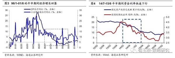 14-15年牛熊主要源于资金。2014年上半年牛市前期,市场普遍担忧经济失速,整体情绪悲观。2013年年末地产调控政策密集出台后,地产销量快速下行,带动各项经济指标快速下行。从2013年12月至2014年3月,房地产开发投资从19.8%回落至16.8%,固定资产投资增速从19.6%降至17.6%。而10年期国债收益率仍在4%以上,利率高企,经济基本面疲弱导致了投资者普遍悲观。但另一方面,货币环境已经开始出现变化。货币政策开始逐渐宽松,2014年4月22日,央行宣布对县域农商行和合作银行定向降准,货币政策开启定向宽松。2014年07月23日,国务院常务会议再次推出十项举措以降低企业的融资成本高企问题,强调要降低企业融资高成本。同时资金利率开始下行,10年期国债收益率14年初的4.6%回落至14年7月的4.2%,下降了40BP。但期间上证综指一直在1974点-2177点的200点之间窄幅波动,创业板指、中小板指的涨跌幅也分别仅有4%、-5%。直到2014年中,投资者对市场分歧仍然很大。我们在14年中期策略报告《拨云见日》中提出股市从危到机,对市场乐观,主要源于市场资金面出现变化。随后也在14年8月系列报告《海内外牛市基因探秘1-3》中提出利率下行趋势已经为A股牛市启动提供了先决条件,资本市场制度建设等方面的变化有望推动市场风险偏好。14年7月底开始,牛市缓缓启动,在2014年11月央行正式下调存贷款基准利率,叠加“沪港通”开通的政策利好之后,上证综指进入快速上涨阶段,推动市场上涨的核心逻辑从基本面切换到资金面。