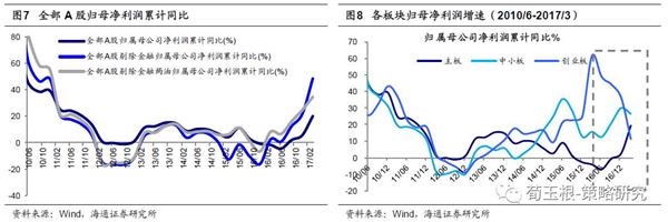16年1月底再次步入震荡市,盈利增长对冲资金略紧。目前悲观的投资者主要是担忧资金面的变化,认为在去杠杆、强监管的背景下流动性已经出现拐点。2014-2015年流动性的松紧变化引发了市场的大起大落,剧烈的市场波动给投资者留下了深刻的印象,所以目前投资者尤其关注资金面变化。但其实从2016年以来,推动市场震荡中枢抬升的核心动力已经从流动性改善切换到基本面的改善。从16年1月至今,十年期国债收益率上涨80BP左右,而上证综指从底部的2638涨至目前3000点附近,核心源于基本面改善。16年全部A股净利润累计同比增速从2016Q1的-1%提升至2016Q4的5.4%。2016年下半年以来主板、中小创分化加剧,也主要是因为盈利趋势不同,从2016Q2到2017Q1,主板净利润增速从-6.7%提高到19.8%,而中小板从12.8%提升到26.8%,创业板则从48.9%降至11.3%,盈利的变化已经成为影响市场的主要变量。