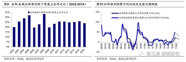 预计17年盈利增长回到两位数。截至2017Q1,全部A股的净利润增速达到19.8%,相对于2016Q4的5.4%大幅改善。根据历史上一季度净利润在全年净利润中的占比,我们将2010年至今的7年间占比最高的25.7%定义为悲观预测,7年间占比最低的23.1%定义为乐观预测,由此可以计算出全部A股悲观/中性/乐观情景下17年全年归母净利润同比的大小,分别为12.2%/15.4%/24.9%。我们根据分析师对各行业板块盈利数据的预测,自下而上汇总测算全年净利润同比增速的情况,预计17年全年净利润同比增长有望达到14%,ROE则有望达到10%。盈利的回升源于两个力量,改革转型带来盈利周期的复苏以及行业结构的变化。第一,改革转型带来盈利周期的复苏。宏观经济增速进入平稳期,改革推动周期性行业上市公司集中度提升,盈利能力提高,消费升级和科技创新持续推进,盈利稳定高增长。第二,行业结构的变化。高ROE、盈利稳定且高增长的消费、科技类行业占比在稳步提升。且行业内盈利能力更强的龙头公司的市占率在提高,详见《盈利两位数增长下的股市-20170509》、《盈利分析系列1-4》。