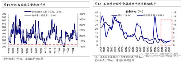 震荡市重结构,一线龙头+金融股。市场的中期格局仍定性为震荡市,既不是牛市也不是熊市。盈利改善对抗资金略紧,金融监管不是货币政策系统性收紧,宏观背景类似于2013年。坚持稳中求进和确保不发生系统性金融风险的总基调下,宏观自上而下分析,系统性机会和风险都不大,考虑管理层调控,市场整体波幅可能处于历史低位,所谓系统收敛。市场的核心矛盾是结构性高估,或者说结构性估值和盈利的不匹配,通过结构分化来消化,所谓结构发散。中期转机仍需时间,跟踪后续监管政策落地情况、二季度宏微观数据。今年来我们一直坚持A股进入二维投资时代,配置角度行业意义弱化,公司地位意义上升,即以二维视角思考,选各领域业绩增长确定的一线龙头股。相关报告如《A股步入二维投资时代》、《A股远景:龙头估值从折价到溢价》、《消费升级:稳稳的幸福》、《消费升级原因及对国产化的推动》。4月市场下跌以来,投资者一直担心前期涨幅较高的白酒、家电、电子、中药等白马股会否补跌?《如何熬过倒春寒?-20170423》、《耐心和信心-20170501》等报告中我们一直强调,不用担心集体补跌,但分化会更大,一线龙头估值盈利匹配度较优,强者恒强。放长点看下半年,重视金融股。目前金融股是最低估、低配的板块,容易出现预期差。基金重仓股中金融占比处于历史较低水平,其中银行5.2%(剔除5只国家队基金为4.4%)、非银2.2%,大幅低配。两者的估值百分位也处于历史的较低位置,目前银行、非银金融PE处在05年以来41%、40%分位,PB处在05年以来7%、14%分位。金融股低估低配本质上原因是对宏观经济企稳没信心,下半年只要经济增长平稳,就会修复对金融股的预期,而且金融监管加强最终利于大银行。