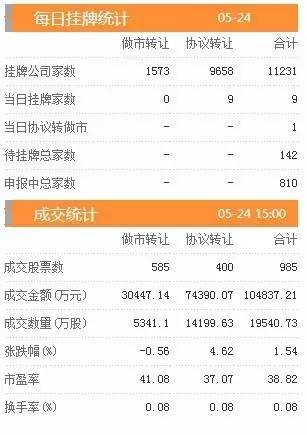 昨日新增挂牌企业9家,挂牌企业总数达到11231家,做市转让1573家,协议转让9658家,待挂牌总家数142只,申报中总家数达到810家。