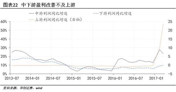 信用风险可能更多来自定价能力不足的中下游领域。当然,与2014年不同的是,PPI转正具有重要的金融含义,工业企业盈利和政府财政收入都同步明显改善,上市公司财务数据也显示企业偿债能力正在提高,大规模信用风险爆发的可能性显著下降。但进一步拆分结构,中下游企业盈利受到成本挤压改善有限,信用事件的发生可能更多来自定价能力不足的中下游领域。