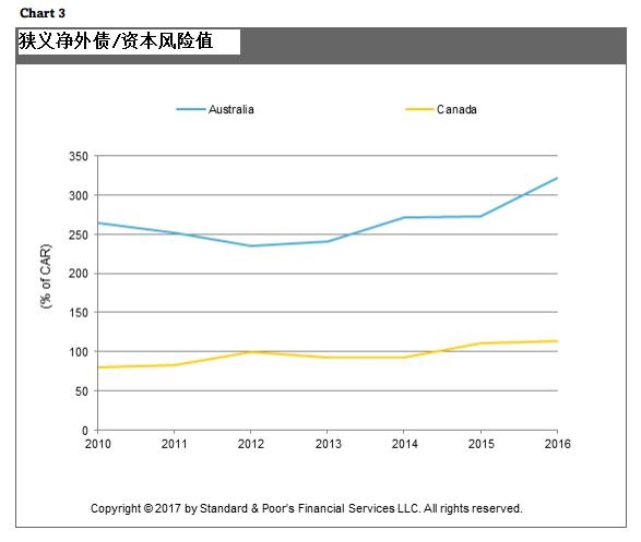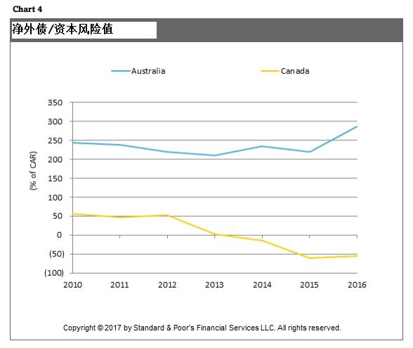 对于澳加两国的金融体统,标普认为虽然总体来说都比较安全,但相比于加拿大,澳洲的金融系统风险更高。原因有两个,一是澳洲的银行对外部因素的变动更为敏感,因为其经常账户持续出现赤字,外债水平较高,而加拿大的经常账户赤字可由外部资产平衡。二是澳洲的银行非常依赖离岸融资,而加拿大的银行虽然也有离岸融资,但总体上借出大于贷入。
