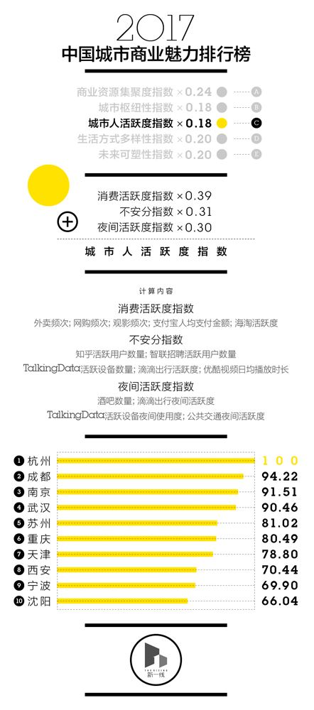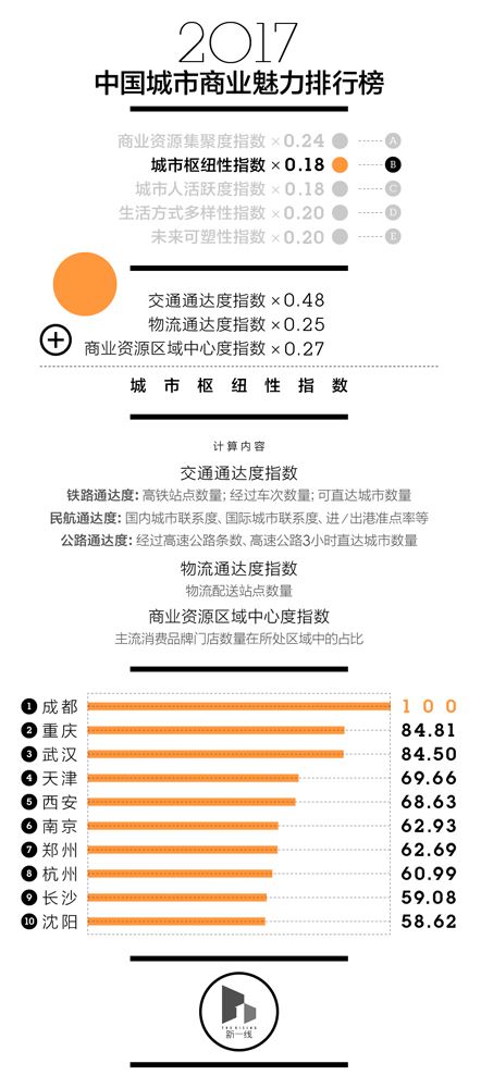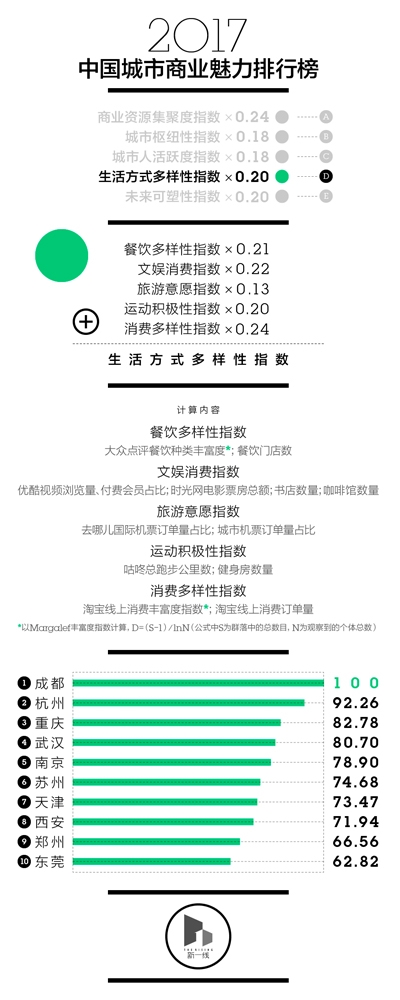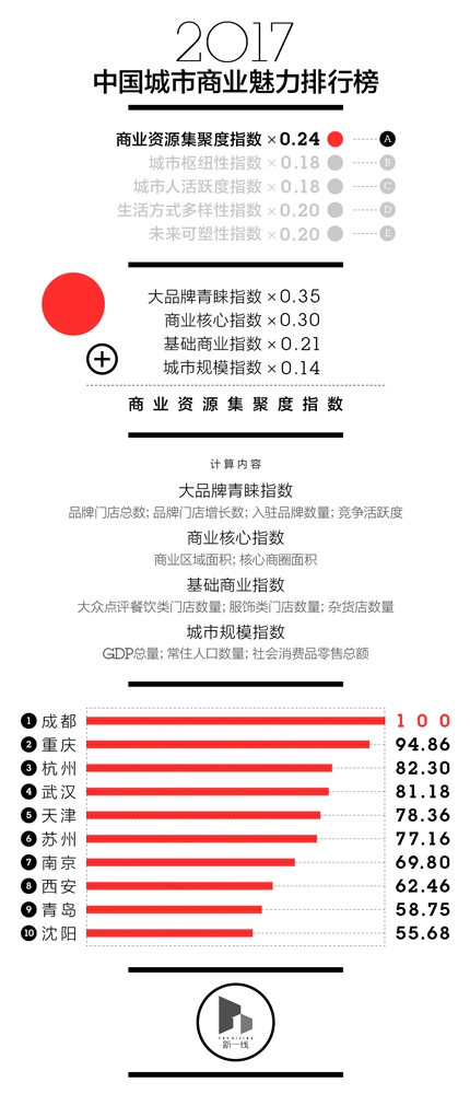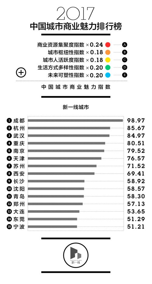 这份2017年最新的城市商业魅力排行榜沿用了上一年的商业资源集聚度、城市枢纽性、城市人活跃度、生活方式多样性和未来可塑性五大指标,但在分析算法做出了一些调整:邀请新一线城市研究所专家委员会为五大指标的权重赋值,以专家打分法的方式计入评分体系;并在二级指标以下的数据中分析采用了主成分分析法客观赋权。
