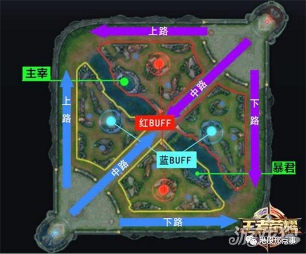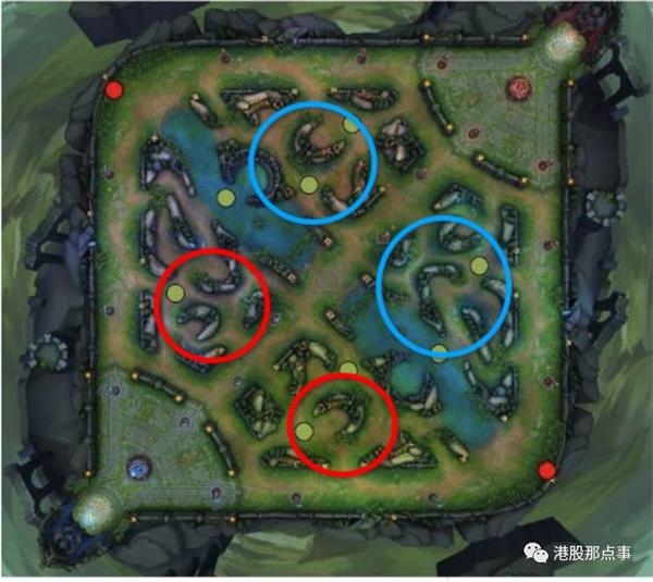 野怪就分布在上图中的圆圈处,假设我方是红色的话,红色圆圈就是我方野怪分布的地方,蓝色圆圈就是敌方野怪分布的地方。