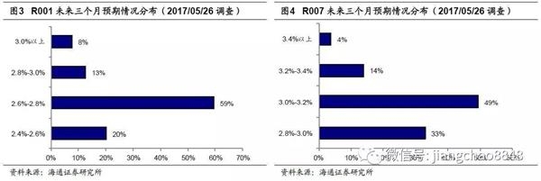资金面预期暂稳。二季度以来货币政策未见放松,货币市场利率中枢维持高位,调查结果显示,投资者预期资金利率将维持现有水平:约59%的受访者认为未来三个月R001中枢将在2.6%-2.8%;对于R007,49%的受访者认为会维持在3.0%-3.2%,33%的受访者认为R007会小幅回落至2.8%-3.0%。