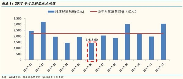 以6月1日的收盘价来测算(下同),2017年全年解禁规模约2.66万亿,3-6月解禁规模均相对偏小,其中6月解禁规模为1418.60亿元,为全年单月解禁规模最小的月份,占全年解禁规模的5.34%。另外,6月解禁规模较5月份(1938.13亿)下降519.53亿,环比下降26.8%。