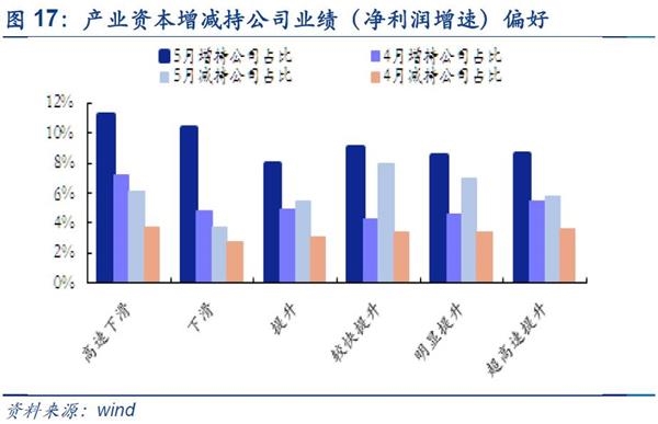 (1)增持方面,5月产业资本对中高市值板块的关注逐步提升。从市值角度,增持公司在中小市值占比为10.03%,略高高于其他市值(小市值9.23%、中高市值8.54%、高市值5.48%);从市盈率来看,增持公司在中低估值的占比为11.54%(低PE8.65%,中高PE9.13%,高PE11.06%);从业绩来看,增持公司明显集中在业绩较差的公司,其中在业绩明显下滑的占比为11.20%(下滑10.36%、提升7.99%、较快提升9.01%、明显提升8.56%,超高速提升8.64%)。值得注意的是虽然5月产业资本依然相对集中在市值偏小且业绩偏差的公司,但中高市值增持占比正在明显增长(4月1.23%→8.54%).