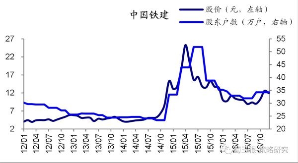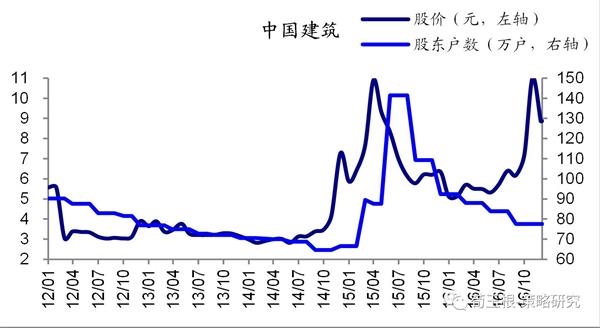 “一带一路”引爆建筑股前,建筑龙头股筹码已非常集中。2014年11月,中央财经领导小组第八次会议召开,专门研究“一带一路”建设。在政策利好刺激下,以中国中铁、中国铁建为代表的建筑板块快速上涨。但实际上在这些建筑行业大盘股上涨前,建筑板块已经经历了长期调整,龙头股的股东数量已经大幅萎缩,筹码已经非常集中。例如中国中铁从77万户降至65万户,降幅16%;中国铁建的股东户数从30万户降至24万户,降幅也达到20%。在2014年10月末,虽然中国中铁、中国铁建在当时的总市值都在700亿左右,但如果剔除集团母公司持股和港股部分,则中国中铁、中国铁建的流通A股比例分别仅占24%、22%。按当时的股价(中国中铁3.1元,中国铁建5.3元)计算,中国中铁、中国铁建的实际流通市值仅分别约为173亿、160亿。
