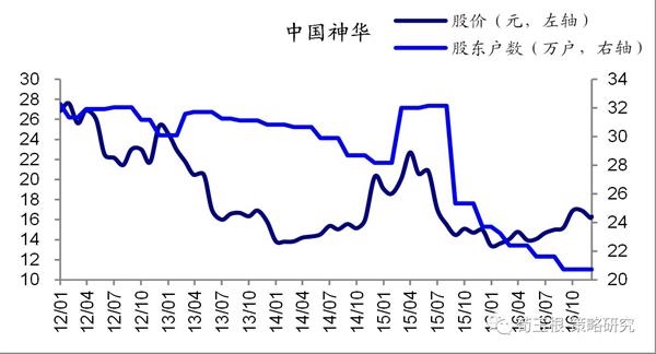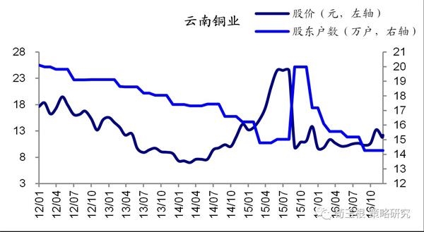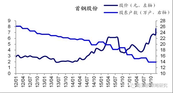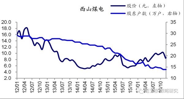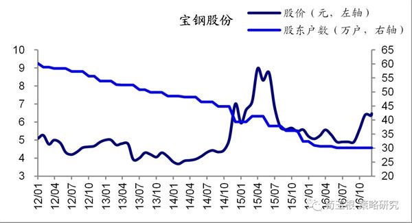 年初周期行业龙头股股东数已经大幅下降。在周期行业迎来大涨前,这些行业的龙头股同样已经出现了股东数下降的现象。2016年一季度,煤炭行业龙头中国神华股东数从2012年出的32万户降至23万户,西山煤电股东数从29万户降至17万户;钢铁行业龙头股宝钢、首钢股东户数也从2012年初的60万户、26万户降至32万户、16万户;江西铜业股东户数从20万户降至16万户。而煤炭、钢铁、有色等周期行业龙头股中存在一种普遍现象,大部分股份由集团母公司持有,市场中实际的流通股份比例相对较少。如中国神华的股东结构中,73%由集团母公司持有,17%是港股,实际流通的A股比例仅剩10%,按2016年年初价格计算的流通市值仅246亿。西山煤电的总股本中54%由集团母公司持有,实际流通A股比例仅剩46%,2016年初流通中市值仅85亿。宝钢股份、首钢股份的股东结构中,同样有80%的股份由集团母公司持有,流通中A股比例仅占20%,两家企业在2016年年初总市值分别为775亿、177亿,但实际上市场中流通的A股市值仅分别为155亿、35亿。江西铜业股东结构中,40%由集团母公司持有,34%是港股,流通中A股比例仅26%,在2016年初流通中的A股市值仅105亿。周期行业大盘蓝筹股实际流通比例已经有限,股东户数总量下降意味着这些行业的筹码已经高度集中。