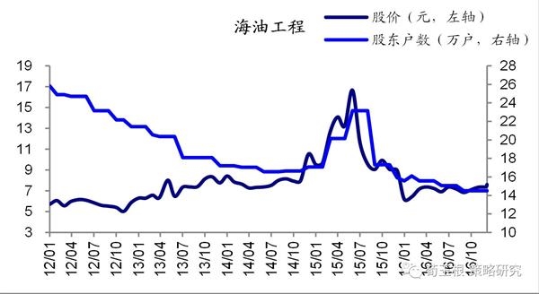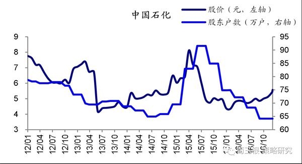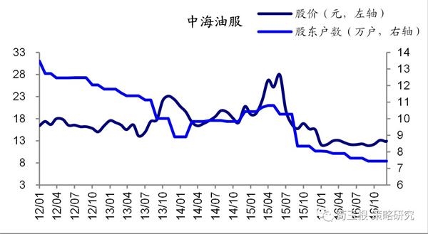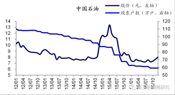 筹码角度看,石油石化龙头股筹码已高度集中。从2012年至今,石油石化板块龙头股的股东户数已经大幅降低。截至2016年四季度,中国石油股东户数从2012年初的110万户降至59万户,中国石化股东户数从77.5万户降至64万户,海油工程从25万户降至14.5万户,中海油服从12.5万户降至7.4万户。尤其是中国石油的股本结构中,剔除H股的11.4%和中国石油集团持股的86%,则流通中A股的比例仅占2.6%,市值仅占369亿。如果进一步剔除中国证券金融股份有限公司、宝钢集团、中央汇金等合计持股比例1.07%,则剩余流通A股比例为1.53%,市值仅占217亿元。