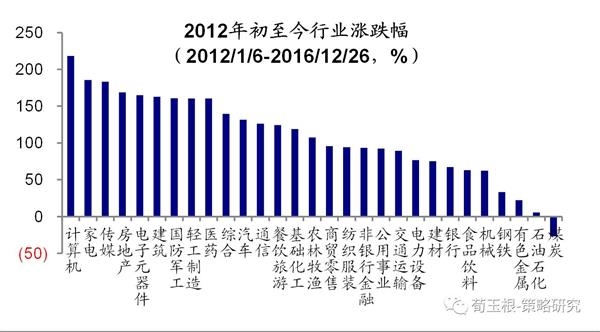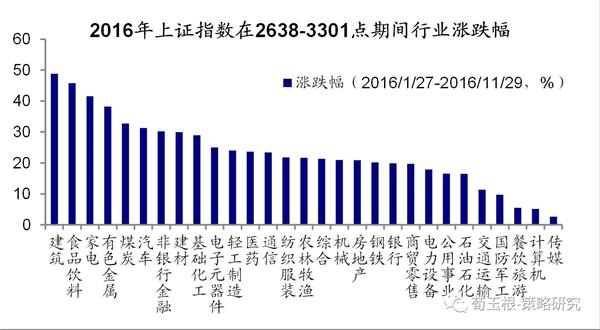 2016年资源品价格回升,周期行业反转。2016年,在稳增长和供给侧改革不断推进的背景下,煤炭、钢铁、有色等资源品价格迎来久违的上涨。全年国内煤炭、螺纹钢、以及铜等原材料价格最大涨幅分别达到105%、75%、35%。资源品价格大幅上涨也带动证券市场上煤炭、钢铁、有色等板块的大涨,2016年煤炭、钢铁、有色板块最大涨幅分别达38%、31%、40%,龙头股如中国神华、西山煤电、宝钢、首钢、江西铜业最大涨幅更是达到43%、63%、41%、74%、72%.