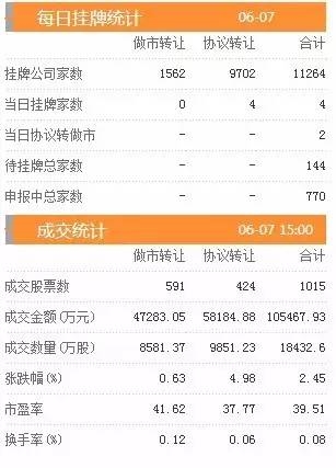 昨日新增挂牌企业4家,挂牌企业总数达到11264家,做市转让1562家,协议转让9702家,待挂牌总家数144只,申报中总家数达到770家。