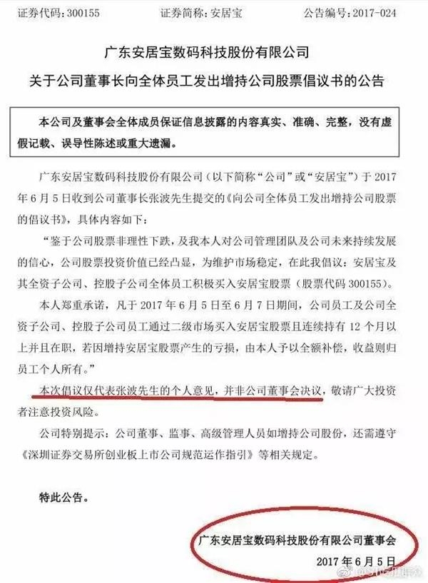 也有业内人士指出,在安居宝发出的,关于公司董事长向全体员工发出增持公司股票倡议书的公告书中指出,凡于2017年6月5日至6月7日期间,公司员工及公司全资子公司、控股子公司员工通过二级市场买入安居宝股票且连续持有12个月以上并且在职,若因增持安居宝股票产生的亏损,由本人予以全额补偿,收益则归员工个人所有。值得一提的是,本次倡议仅代表张波先生的个人意见,并非公司董事会决议,敬请广大投资者注意投资风险。