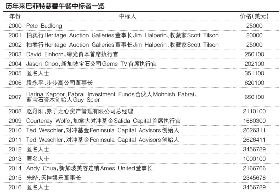 在过去17场巴菲特慈善午餐竞拍中,有3名来自中国的中标者获得了与巴菲特共进午餐的机会,分别是步步高董事长段永平、赤子之心资产管理公司总经理赵丹阳、天神娱乐董事长朱晔。他们3位的竞拍价格之和达到508万美元,占了17次竞拍金额总和的近四分之一。