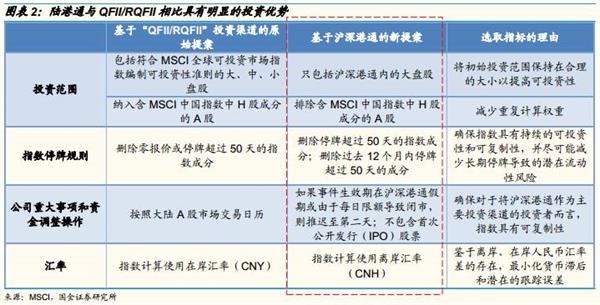 ①无配额限制,而QFII/RQFII均有一定的配额限制;②所有投资者均可以参与,而非“合格投资者”;③资本流动无锁定期以及汇出限制,大大促进了资本账户开放。④沪深港通南北向资本流动每日投资均有130亿的限额,由此陆港通每日流入限额共260亿,由于新方案缩减了纳入MSCI的A股股数,导致资金增量并不会太大,陆港通的260亿限额不会形成实质的限制;⑤仅有陆港通名单中的沪深股票才能纳入MSCI,而非全部沪深股票,纳入的A股数量由最初方案的448支缩减到169支。