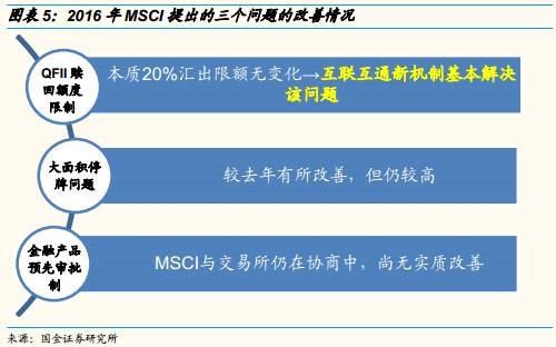 1)采用互联互通新机制替代QFII打破了资本赎回限制:MSCI在3月23日公布了2017年指数调整市场问询方案,提出通过沪股通和深股通的互通政策来配置A股,跳脱了一贯采用QFII的方式。