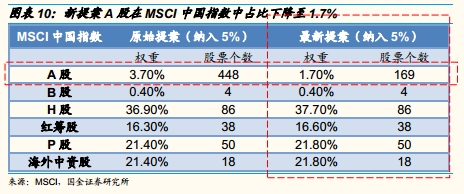 若MSCI在6月宣布将A股纳入新兴市场指数,一般而言将在2018年5月中旬的MSCI半年度审核会议宣布执行,生效时间为2018年6月1日。由于新版方案中建议只纳入可以通过沪港通和深港通买卖的大盘股,且剔除了两地联合上市公司中对应H股已是MSCI中国指数成份股的A股,以及停牌超过50天的股票,共计169支。考虑纳入的A股数量从448支缩减到169支,假设纳入比例为修正提案中的5%,按MSCI公司的测算,中国A股在MSCI中国指数中的权重由之前方案的3.7%下降到1.7%,在MSCI新兴市场指数中的权重由之前方案的1.1%降至0.5%,在MSCI亚洲(除日本)市场指数中的权重从1.3%下降到0.6%,在MSCI全球市场指数中的权重为0.1%。