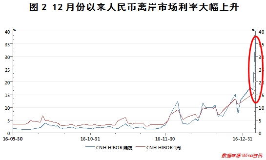 一是人民币离岸市场流动性紧张。自从2016年12月份以来,离岸人民币(CNH)市场的流动性就出现一定程度的紧张(参见图2),元旦后,资金面紧张的局面更加严峻,导致离岸人民币市场利率大幅攀升。Wind数据显示,本周以来隔夜离岸人民币同业拆借利率(CNH HIBOR)连续三天大幅上涨,分别达到17.76%、16.95%、38.34%,而去年12月和11月CNH HIBOR的平均水平仅为7.8%和2.1%。离岸市场利率的高企导致人民币空头的成本大幅提高,从而促使人民币空头平仓,导致人民币大涨。