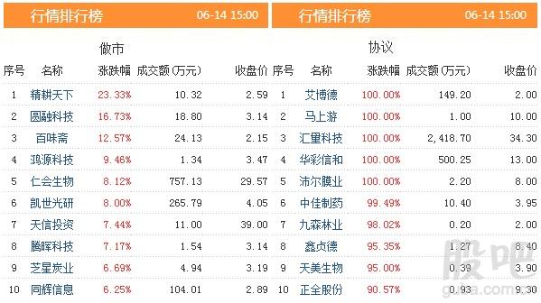 昨日共有998只股票发生交易,成交金额9.14亿元,做市转让成交3.31亿元,协议转让成交5.84亿元,成交数量16731.54万股。