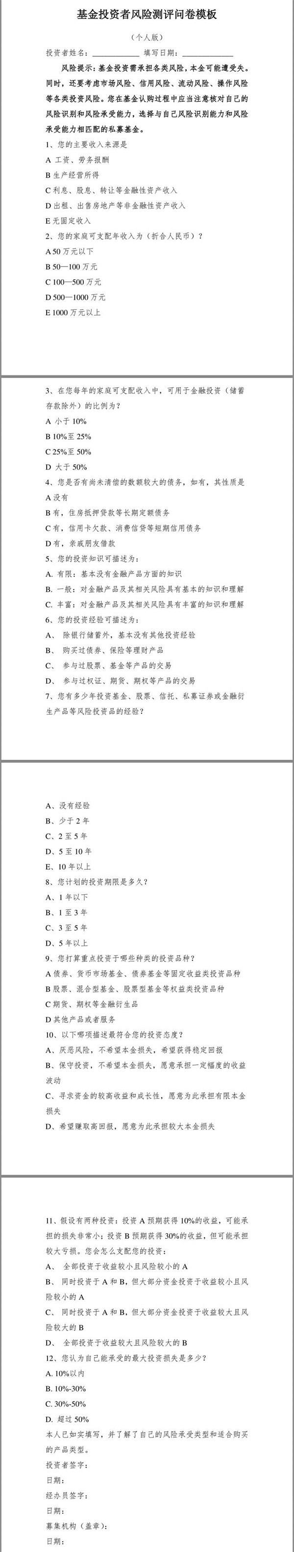 附:基金投资者风险测评问卷(个人版)
