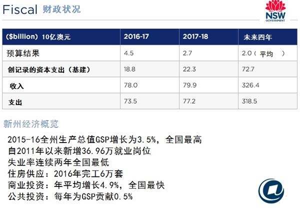 新州预算案报告显示,州政府预估2016-17财年将创财政盈余45亿澳元,预计2017-18财年创盈余27亿澳元,未来四年平均盈余20亿澳元。同时债务为历史最低,债务GDP比为大陆地区最低。