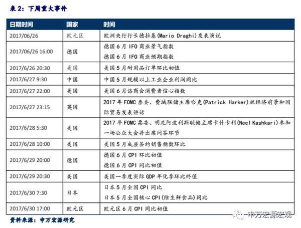 本周6月议息会议前,通胀和零售数据公布后,数据不佳,影响市场情绪。但美联储表示经济活动继续温和扩张,劳动力市场温和且稳健,家庭收入、支出有所复苏,于是提高利率至1%-1.25%。6月份议息会议后的经济预测以及利率点阵图来看,对比3月份的会议情况,利率点阵图显示利率2017年加息路径不变,美联储对经济前景整体乐观。预计2017年加息三次,年内还有一次加息。节奏不会太快,下次预计会在12月,风险面需要继续观察特朗普财政与通胀预期是否会超预期抬升。
