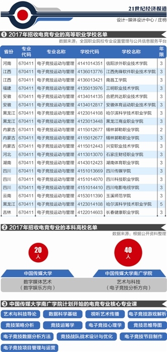 21世纪经济报道记者在全国职业院校专业设置管理与公共信息服务平台查询发现,目前国内有18所高职高专院校拟在今年招收该专业学生。另外,中国传媒大学和中国传媒大学南广学院,还将在今年招收全国首批本科电竞方向学生。