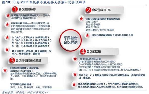 写在前面的话:6月20日军民融合发展委员会第一次全体会议召开,标志着军民融合进入实质性推进阶段,从初步融合向深度融合。军民融合是近年来中国军事变革的重大战略部署,其顺利实施会提升中国军工的可持续发展能力和创新能力,直接提高军队战斗力,有利于改善中国国际战略格局,维护遍布全球的国家利益。军民融合并不是孤立的,面对当前美国的战略压迫,中国需要具备与经济地位相称的军事能力,军民融合应运而生。军民协同创新,实现经济与国防的良性互动,是工业发达国家的共同特点,是强国的必经之路,是必须牢固坚守的国家战略。军民融合最新进展和当前投资机会如何?本篇报告为您解读。