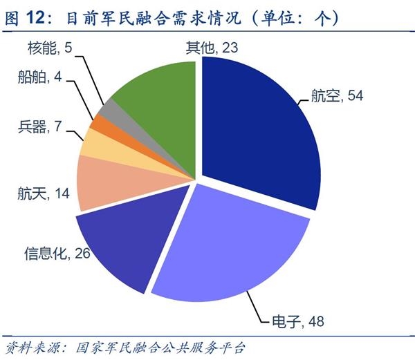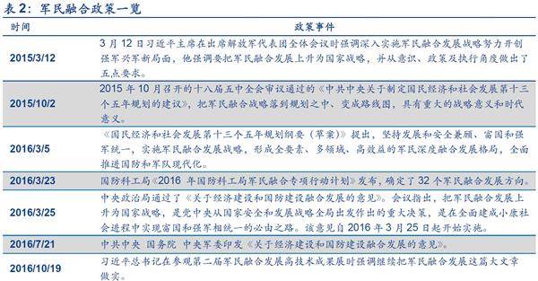 ■军民融合是大势所趋:20余年的和平发展让中国成为世界经济第二大强国,但在军事发展的脚步却稍显落后。当前,复杂的国际形势和中国未来的大国崛起之路更加需要强劲的军事实力保驾护航,但目前我国军事发展面临的是外延式提升面临预算约束和内涵式发展动力不足两大掣肘。如果能解决这两方面的问题,中国军事实力就能获得巨大提升。军民融合正是在此背景下应运而生,于2015年正式上升为国家战略。