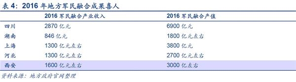 军民融合产业收入和产值突破新高.2016年是完整推行军民融合政策的第一年,各地军民融合产业发展良好。其中四川省2016年军民融合产业收入达到2870亿元,湖南省军民融合收入1166亿元。