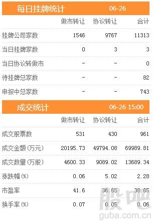 昨日新增挂牌企业3家,挂牌企业总数达到11313家,做市转让1546家,协议转让9767家,待挂牌总家数82只,申报中总家数达到743家。