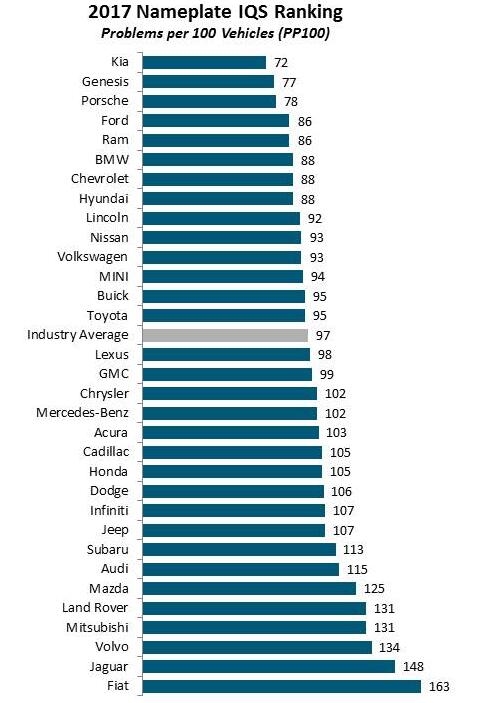 Genesis(77 个PP100)排在第二位,其次是季军保时捷(78 个PP100)。福特和Ram(86个 PP100)并列第四。