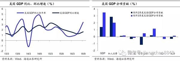 美国上半年经济可能走弱。美国16年3季度GDP增速回升至3.5%,但其中主要贡献来源于出口和存货,出口受益于此前美元贬值,存货受益于商品价格上涨,这两者均不可持续,而最主要的消费贡献只有2%,占比最大的服务消费增长低迷。目前美国上一轮地产周期刚刚结束,而设备投资持续低迷,唯一有起色的是库存投资,说明本轮美国经济反弹仍属于库存周期,除非特朗普上台之后的企业大幅减税政策真正兑现,才有可能改善企业的预期,从而启动设备投资周期,但这最早也要等到17年下半年。再加上过去3年美国经济习惯性开局低迷,意味着17年上半年美国经济或重新走弱。