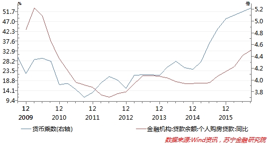居民加杠杆购房被称为“货币创造加速器”,从我国货币乘数与金融机构个人购房贷款增速的高度相关性也能得到佐证。2010年下半年房地产信贷政策收紧之后,个人购房贷款增速大幅回落,同时货币乘数也显著回落,至2011年9月货币乘数降至3.71。在2015年以来的房地产上升周期中,个人购房贷款大幅增加,货币乘数也显著回升,至2016年9月末,个人购房贷款同比增速达到历史新高33.4%,而货币乘数也上升到近年来高点5.22(参见下图)。由此看来,房地产市场的货币创造加速器功能,使得即便是在央行收紧基础货币发行和资产负债表的情况下,金融市场也不会感受到整体资金供应紧张的压力。然而,这一加速器在房地产调控再度收紧背景下即将暂时熄火,货币乘数下行趋势将不可避免,这将加剧资金整体流动性偏紧的趋势。