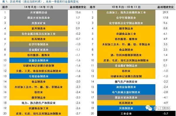 上一轮库存拐点(2014-08)后一季度,盈利端行业比较排序:上游采掘>消费制造(可选>必需)>设备制造(工业>消费)>加工冶炼(石油化工>基本原材料);