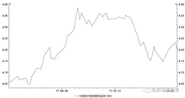 5月12日我们提出“监管协调2.0”以来,债券市场收益率开始见顶回落,10年期国开债收益率从最高点4.38%(5月10日)下降到最低4.15%(6月27日).但6月27日-7月3日债券市场出现了明显的回调,10年期国开债收益率上行至4.23%(7月3日),国债期货T1709连续5个交易日出现下跌,跌幅约为-0.89%。