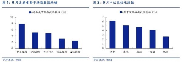 6月中信风格指数均获得正收益,消费、成长、周期、金融和稳定风格涨幅分为为6.12%、5.11%、4.71%、4.01%和5.28%。