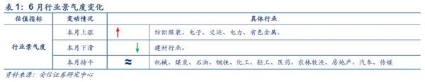 上游资源品受中游高景气支撑,煤炭、有色金属库存下降,价格走高;国际原油价格受多方博弈影响,月底小幅反弹,整体仍是低位运行。7月建议继续关注受供给侧约束提供保护的部分细分领域,例如电解铝以及稀土、锂、钴。具体而言,煤炭方面:进入夏季迎来用电高峰,叠加环保督查因素导致内蒙古等地产量缩减,煤炭价格高位反弹,值得注意的是,6月底发改委强调坚决抑制煤炭价格过快上涨,原则上动力煤成交价格不超过570元/吨的绿色区间上限;同时6月6大发电集团日均耗煤同比涨幅从上月的10.99%下滑至5.55%,后期煤炭需求上涨动能或将减弱,我们预计7月煤价涨幅受限,行业景气较此前持平。石油方面:美国原油产量下滑且库存连续下跌导致6月后期油价低位反弹;美国经济数据走弱导致美元承压,利好油价,但OPEC可能进一步增加减产力度,预计7月油价跌幅收窄,行业景气较此前持平。有色方面:6月LME有色金属多数上涨,LME铅、LME锡小幅收跌。国内建议关注电解铝、锂、钴和磁材等(去产能、新能源汽车利好)以及稀土整顿专项行动。6月COMEX黄金下滑,美国偏弱的经济数据使得近期加息预期有所降温,黄金后续走势或将震荡企稳。7月预计行业景气较此前上升。