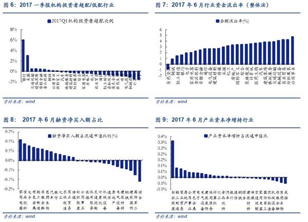 防御板块依旧抱团,有色唯一净流入。根据6月资金流出、杠杆买入以及产业资本动态情况,并结合2017Q1机构投资者行业仓位配置,我们认为目前市场对防御性较强的金融板块及家电、食品饮料板块依然坚持,并开始重新审视周期品存在的结构性亮点,例如有色板块。具体而言,周期板块低位加仓,6月有色金属、钢铁、轻工制造等板块市场整体资金流出最小,其中有色金属成为唯一实现资金净流入的板块,同时受到融资资金和产业资本的追捧。其次,防御板块配置价值凸显,金融板块超配之下继续加码,6月份非银和银行资金净流出压力较小。其中,银行融资净买入比例排名靠前。同时,消费白马依然受到追捧,家电和食品饮料市场整体资金净流出率较小,杠杆资金买入居前。另外,房地产板块资金流向持续向好,获产业资本青睐,6月房地产增持11.72亿元,连续增持13个月,多家地产公司公开表明对公司未来发展前景的信心。值得注意的是近期资金TMT板块有所流入,尤其是电子板块受到杠杆资金和产业资本增持,产业资本对计算机也明显增持。整体来看,6月产业资本对于成长板块的增持规模并不多,尚未形成趋势且增持标的相对集中(大华股份增持9.05亿元,欧菲光增持7.73亿元),不能对当前成长板块提供有效支撑,也无法从中看出当前成长板块反弹能够持续.(详见《6月成长增持是否意味着持续反弹?——产业资本跟踪月报20170703》)。除此之外,6月份国防军工延续资金持续流出的局面,遭到融资资金和产业资本双双减持,市场整体资金净流出压力仍然较大。