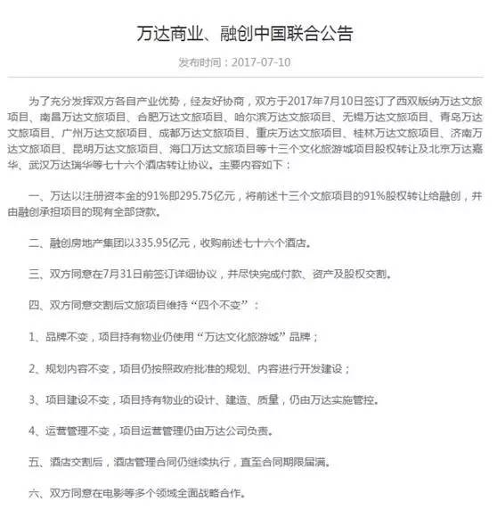 万达商业、融创中国7月10日联合公告称,融创房地产集团以335.95亿元收购万达项目76个酒店。万达将十三个文旅项目的91%股权转让给融创,融创承担项目贷款。