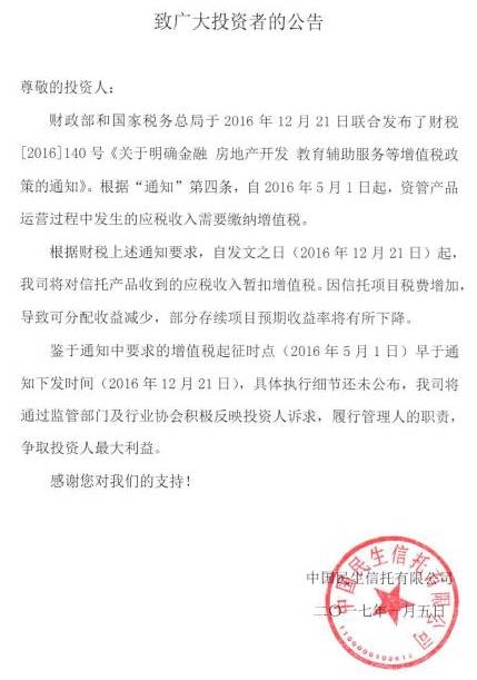 民生信托这份公告里说的已经很清楚了。小编了解到,140号文下发后,已经有好几家北京的信托公司着手安排相关缴税事宜,其中就包括民生信托。不过,今天补充通知下发后,民生信托又赶紧发了一份公告: