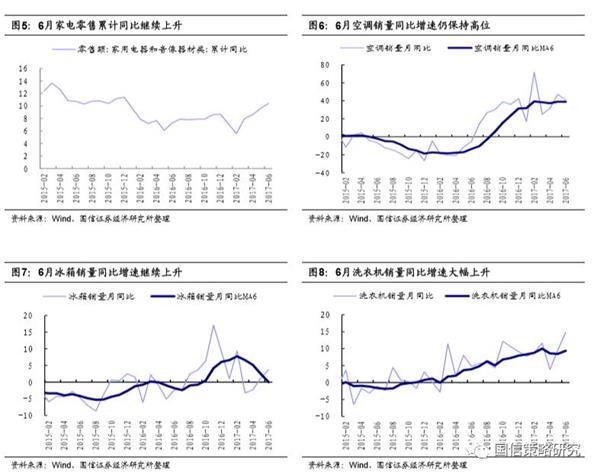 6月家电音像累计零售额同比增速继续上升。家电音像累计零售额同比增速达到了10.4%,是2016年以来的最大增速。空调销量6月同比增速41.4%,冰箱销量同比增速3.7%,洗衣机销量同比增速14.8%。2016年下半年以来家电行业受益于房地产市场的行情一直处于销量回升通道,目前阶段高企的同比增速未来能否维持一方面于房地产销售数据的未来的走向,另一方面消费的复苏和升级也会带动白电销量的进一步提升。受益于消费回暖和经济向好,我们预计未来家电销量同比增速仍将保持高位。