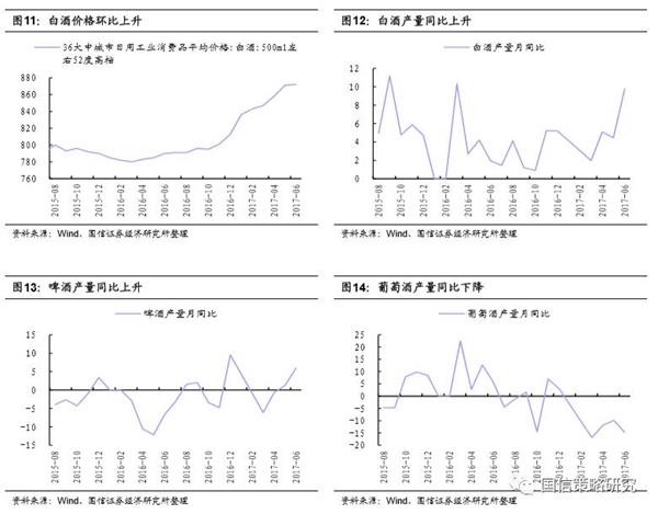 白酒行情延续。白酒产量6月同比增速大幅上升,价格环比微涨,白酒强势行情延续。啤酒、葡萄酒较上月产量增加,但葡萄酒产量同比增速降低,整体来看,白酒、啤酒处于景气向上周期。