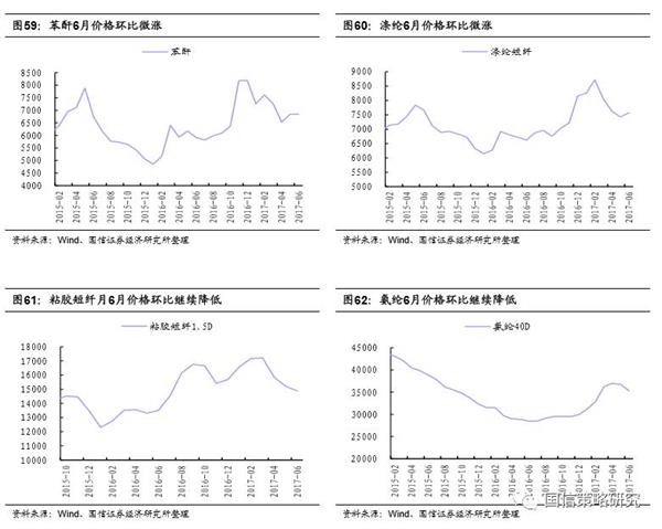 化肥农药方面,尿素出厂价6月环比增速8.6%,较上月-8.2%的环比增速大幅提升,磷酸二铵价格环比增速-2.1%,略高于上月-4%大幅下降,复合肥价格与上月持平。纤维原料方面,苯酐6月环比增速0.1%,低于上月4.8%的环比增速,涤纶短纤6月环比增速2%,高于上月-2.7%的环比增速。粘胶短纤1.5D 5月环比增速-2.1%,高于上月-4.1%的环比增速。氨纶40D 6月环比增速-3.8%,低于上月-0.7的环比增速。基础化工方面,轻质纯碱6月环比增速7.6%,高于上月-5.9%,烧碱6月环比增速1.4%,高于上月0.8%,氯化钾价格与上月持平,纯MDI 5月环比-7.3%,高于上月-13%环比增速。其他化工原料氢氟酸5月环比增速3%,高于上月-1.4%环比增速,碳酸氢钙环比下跌1.5%。三氯氢硅、钛白粉价格与上月持平。